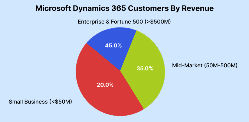 - Mid-market companies ($50M-$500M in revenue) – 35% of users: Mid-size companies often use Dynamics 365 as they grow. It works well with Microsoft 365 tools and allows them to add more features over time based on their business needs.